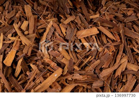 Broken ceylon cinnamon macro texture, cinnamomum verum bark pieces pattern