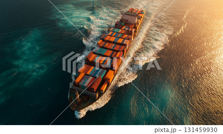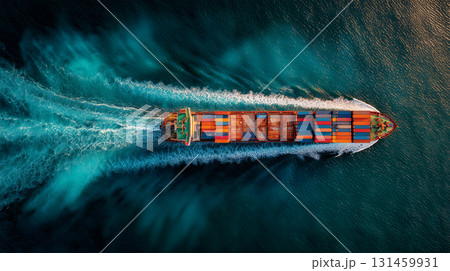 斜め構図で進むコンテナ船と白波