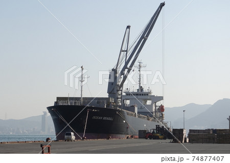 下関商港岸壁で荷役中の貨物船