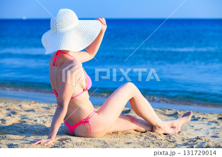 Woman in big straw sunhat sunbathing on a sandy beach. Summer holidays concept