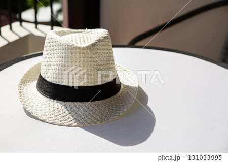 white hat on the table on a sunny day, vacation or vacation concept