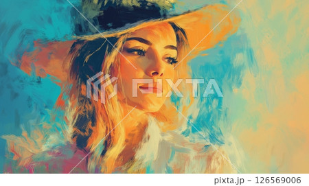 Colorful portrait of a mysterious woman wearing a hat in a creative art style