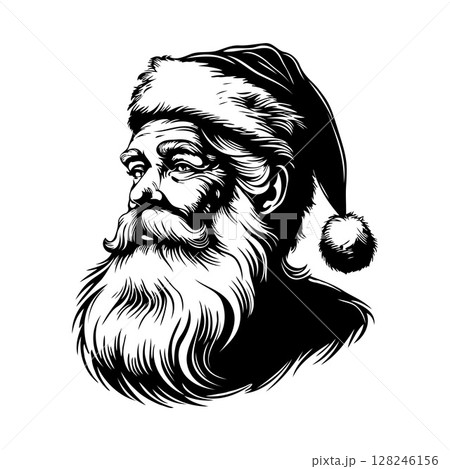 Detailed black ink sketch of Santa Claus head with fluffy hat and beard on white background, concept of Christmas vintage holiday art