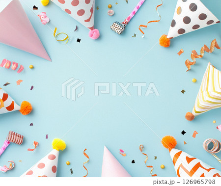 A cheerful blue background adorned with vibrant birthday party hats, streamers, and confetti, creating a festive frame.