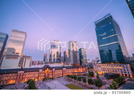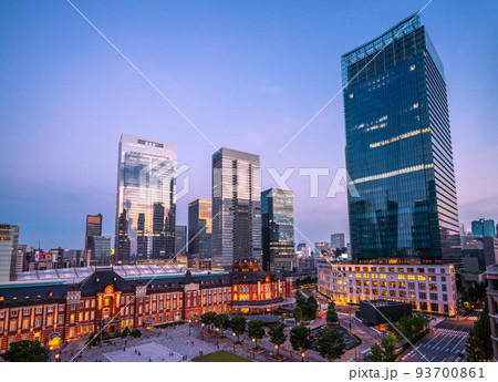 日本の東京都市景観 東京駅新景色。ズラリ並んだ超高層ビル群(窓ガラスに映る夕焼け)・夜景
