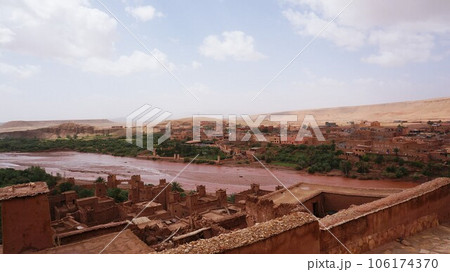 大雨の後のアイット・ベン・ハドゥ対岸の集落とアジフ・オウニーラ川【モロッコ】