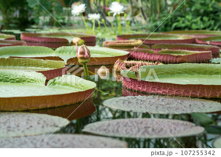 floating leaves and blooming bud of a giant water lily Victoria amazonica