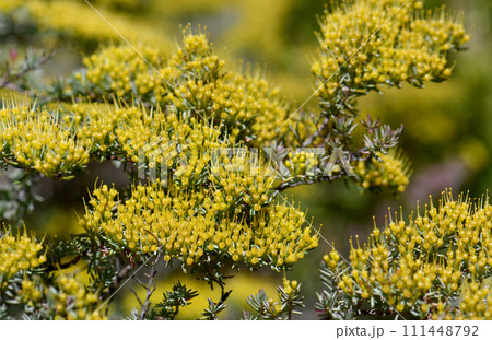Yellow nectar filled flowers of the rare Australian native Homoranthus prolixus, family Myrtaceae. Endemic to heath in crevices on granite outcrops in northern NSW near Inverell