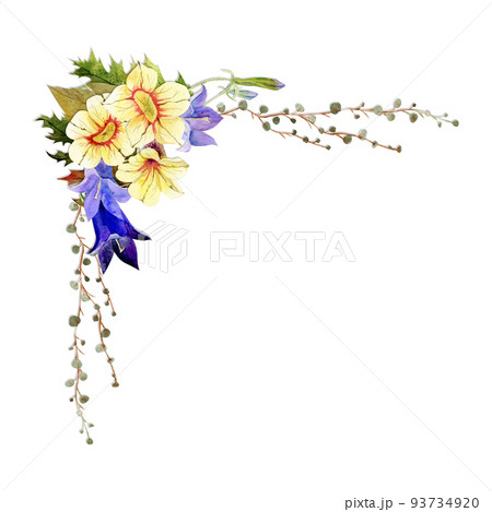 Watercolor frame arrangement with hand drawn autumn petunia and bluebell flowers, branches and leaves. Isolated on white background. Design for invitations, wedding, greeting cards, wallpaper, print