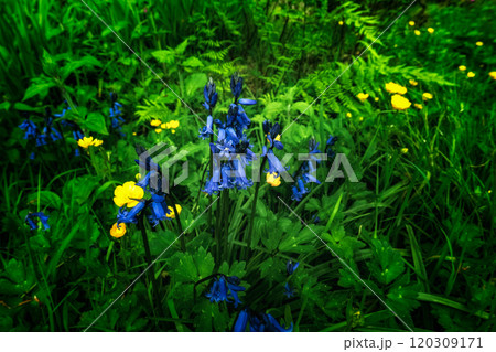 Yellow buttercups and bluebells grow amidst lush green grass and ferns. Several blooms are visible, showcasing vibrant colors.