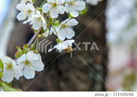 Close up view of working honeybee on white flower of sweet cherry tree. Collecting pollen and nectar to make sweet honey.