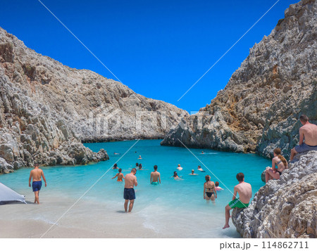 崖に囲まれた秘境のビーチ (ギリシャ、クレタ島、セイタンリマニア)