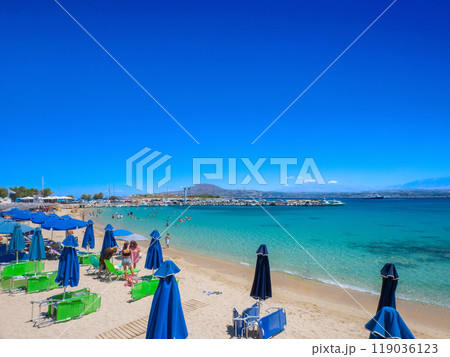 パラソルが並ぶ穏やかな白砂のビーチ (ギリシャ、クレタ島、マラティビーチ)