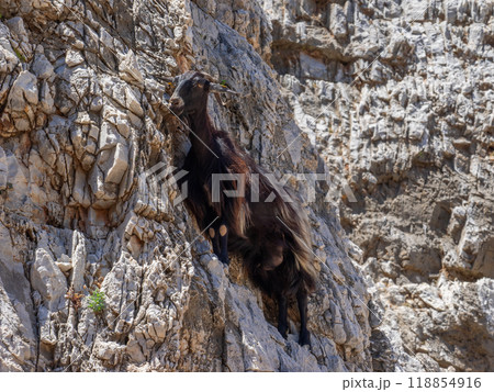 切り立った崖の急斜面に立つ黒ヤギ (ギリシャ、クレタ島)
