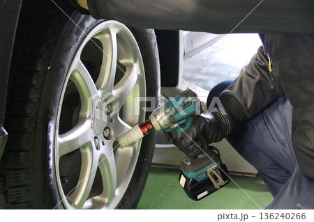 冬タイヤに交換した後にトルクレンチを使って締め付けトルクの再点検をしている様子