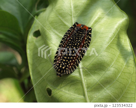 生き物 昆虫 ビロードハマキ、派手なゴキブリのように見えますがこれでも蛾です