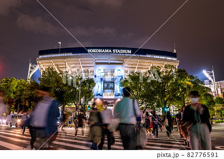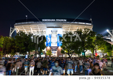 日本の横浜都市景観 横浜スタジアムなどを望む。試合が終わりスタジアムから出て来たファンら=14日