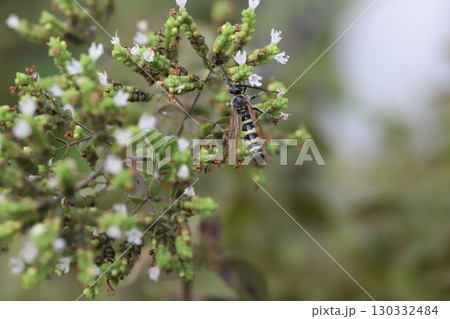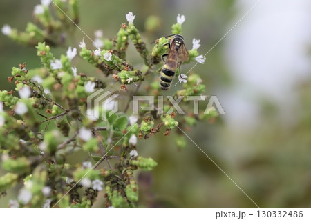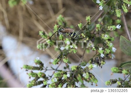 夏の庭に咲くオレガノの白い小さな花の蜜を吸うヒメハラナガツチバチ
