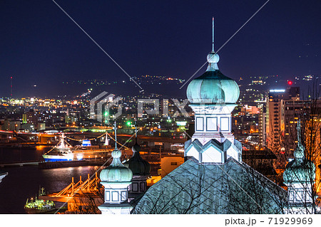 函館ハリスト教会と函館港の夜景 重要伝統的建造物群保存地区 北海道 函館市