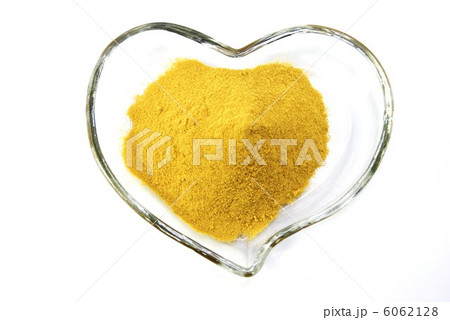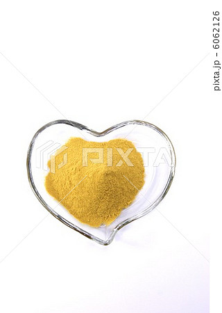 健康食品・ハート型透明皿に春ウコンの粉末・俯瞰引き横位置