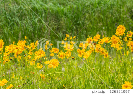 春の公園に咲く黄色いオオキンケイギクの花おピンク色のスイセンノウ(酔仙翁)の花