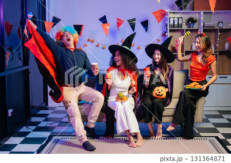Halloween party with friends in costumes, enjoying drinks, food, and festive decorations. Perfect for autumn gatherings