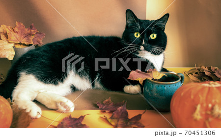 Black and white cat is lying on brown-orange autumn backdrop with dry leaves and pumpkins and looking at camera. Halloween, thanksgiving cozy home image with lovely pet. Toned image. Selective focus.