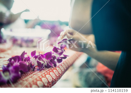 ハワイ、ワイキキにて蘭のレイ作りを体験する若者
