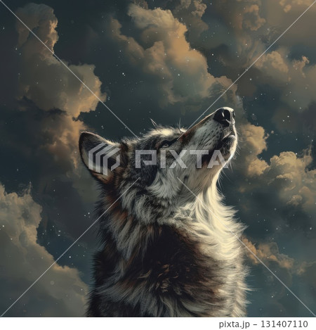 The wolf stands tall, its gaze directed upward, as if contemplating the mysteries hidden in the endless sky above.