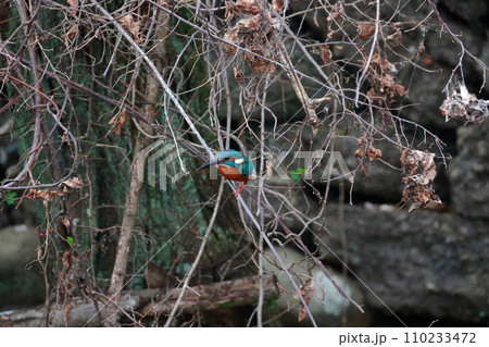 青いカワセミが自然の枝で休息・野鳥撮影