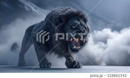 Fierce black lion roaring with mouth open and sharp fangs, walking through mist with a dramatic background