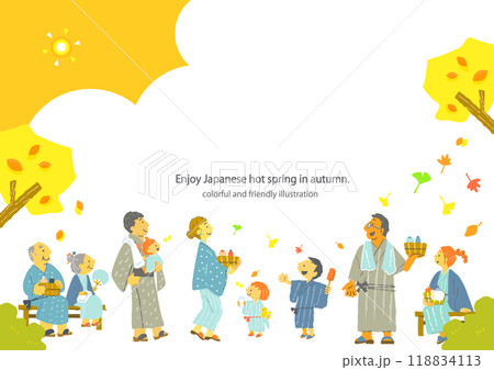 秋の温泉地を楽しむ人々 カラフルで楽しい手描きイラスト