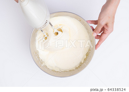 おうちでお菓子作り スポンジ生地つくりの工程 ハンドミキサーで卵と砂糖を混ぜる様子 真俯瞰