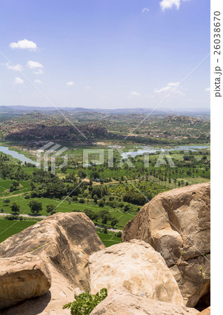 インド ハンピのハヌマーン寺院、通称モンキーテンプルの丘から望む風景