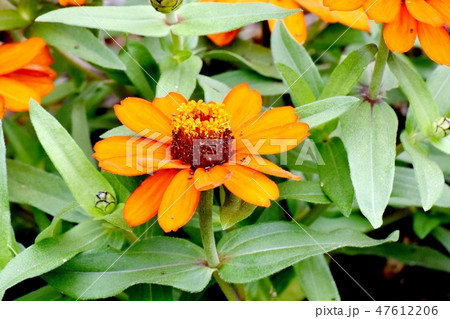 三鷹中原に咲くオレンジのヒャクニチソウ(ジニア)の花
