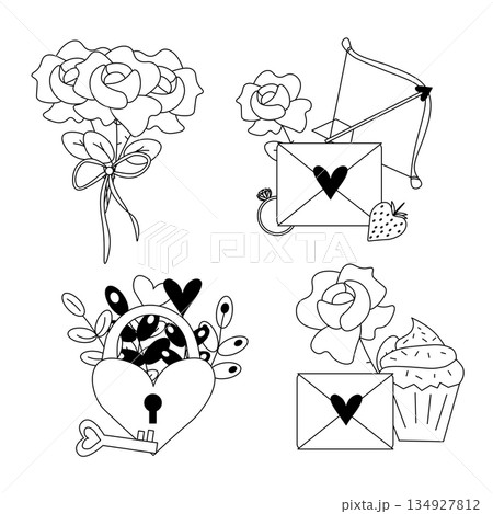 Valentines day elements set. Valentine's Day composition set. Vector graphic line black and white illustration. For poster, flyer, banner, invitation, social media, party or sale