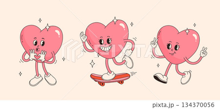 Groovy hearts characters. Retro style heart various poses. Valentines day character in love, romantic mood, cute Cupid. Funny mascots neoteric vector set