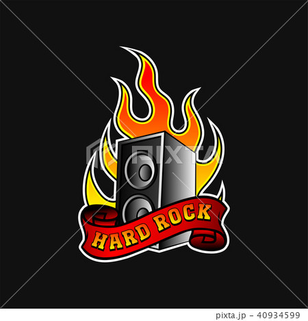 Subwoofer in hot orange flame and red ribbon with text Hard Rock . Music theme. Vector element for