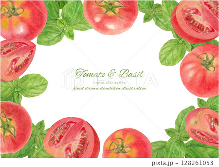 ジューシーなトマトとバジルの水彩イラスト。夏野菜。(ベクター。レイアウト変更可能)