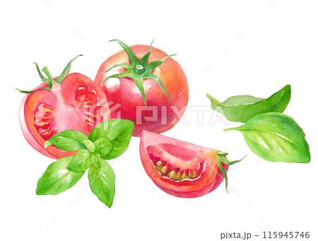 水彩手書きのフレッシュなトマトとスイートバジルのカットイラスト素材
