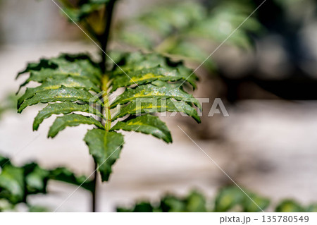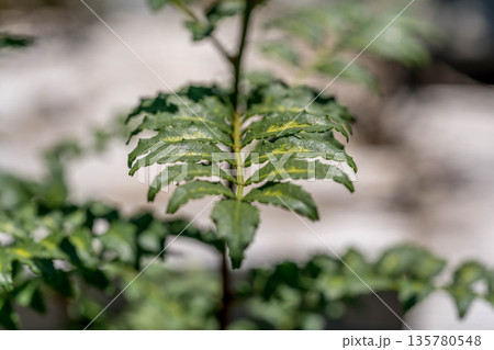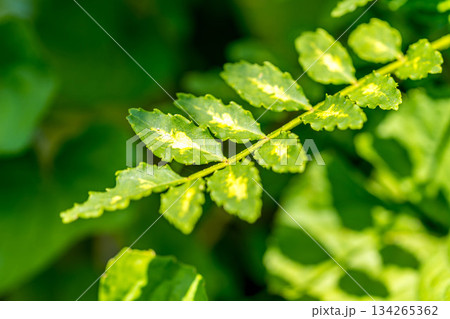 A branch of bright green leaves is displayed against a white background. The leaves have a smooth surface and vary in size and shape. This branch shows the vibrant colors found in nature