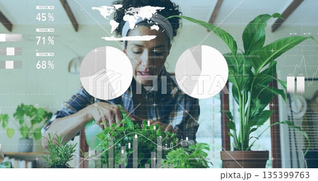 Woman in plaid shirt tending plants with watering can in living room, with data overlays