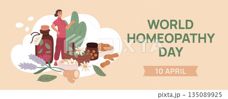 World homeopathy day. Female herbalist, green pharmacy ingredients, natural medicines and cosmetics, berries, roots, cartoon flat garish vector alternative medicine concept