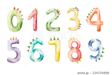 Cute dinosaur numbers. Watercolor hand drawn prehistoric illustration for invitation card, nursery poster. Sketch on transparent background. Perfect for for nursery and baby shower, tropical design
