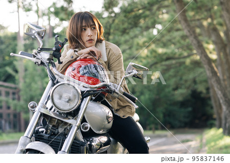 バイク女子イメージ バイクに寄り掛かる若い女性