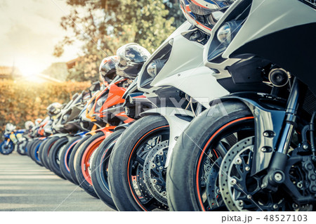 Motorcycles group parking on city street in summer