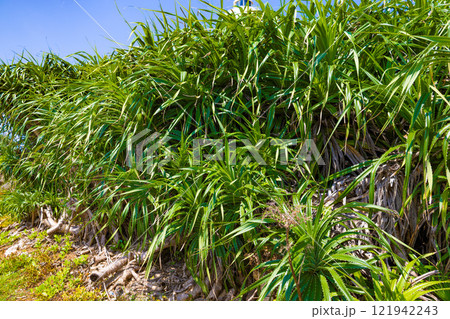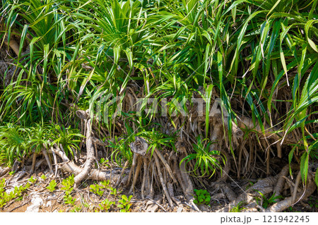 南国リゾートのバカンス・小さいパイナップルやジャングルのようなパンダナスの木と実(沖縄県宮古島市)