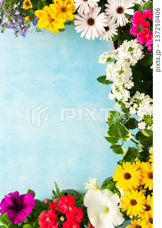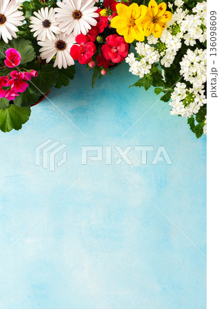 Colorful spring flowers decorate a home balcony, creating a vibrant atmosphere. This scene showcases various blooms against a bright blue background, enhancing the outdoor space charm, banner