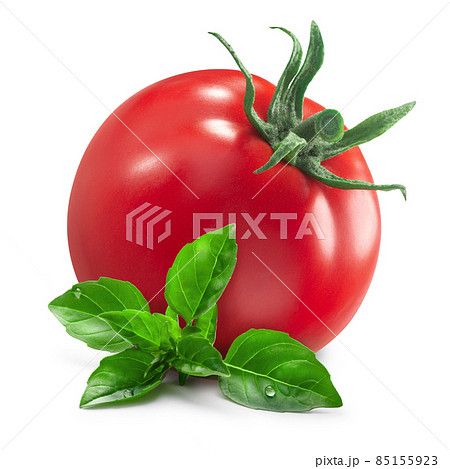 Fresh Tomato with tiny greek basil leaves isolated