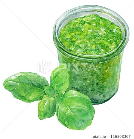 バジルペーストとバジルの葉 水彩イラスト